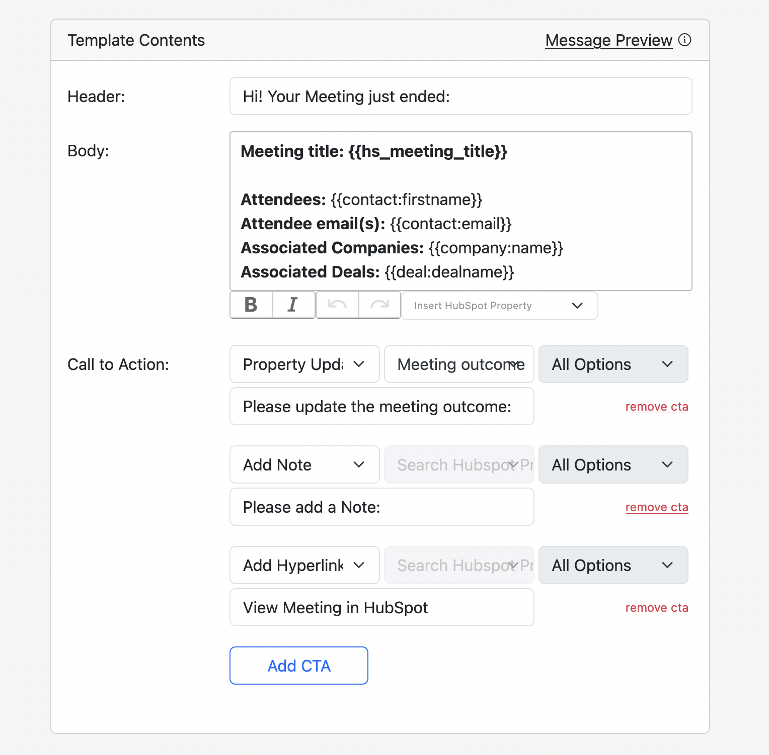 For example, you could insert CTAs such as add meeting outcome, add a note, and add a hyperlink redirecting to that object in HubSpot. For this, select Property Update from the first dropdown. Then select the relevant HubSpot Property from the second dropdown. Then add a brief message with your CTA.