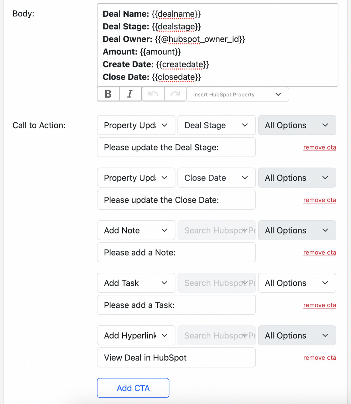 - Call to Action: The CTA section enables the message receivers to use action buttons to update data back on HubSpot from the Slack/ MS Teams message they receive. You can add as many CTAs as you want here. All the standard or custom HubSpot Properties that exist in your CRM will be available to choose from.