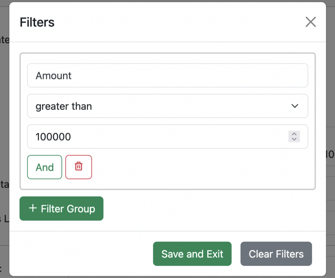 Step 5.2: Filters: You can choose to filter associated Deals against specific criteria. For example, you might only want to see associated Deals that are above $100k in Amount. To do this, click on Add Filters, then click on + Filter Group.