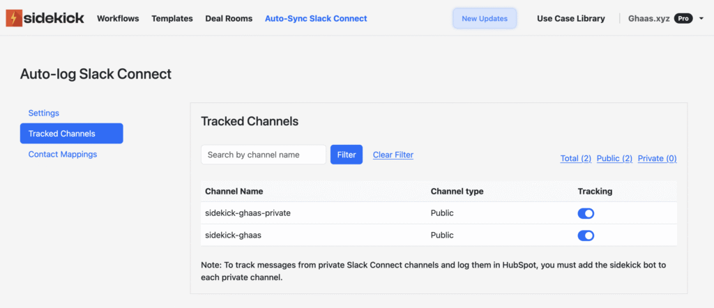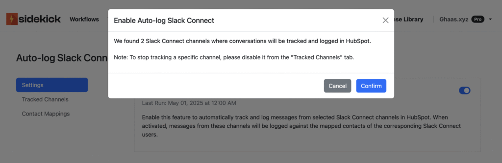 Step 4: Toggle the first switch on. A pop-up will show how many Slack Connect channels were detected. Click Confirm. With this, Sidekick will now auto-sync new messages received in the selected Channels every evening, and add them as a custom activity in your HubSpot.