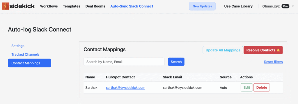 - Click on the red Resolve Conflicts button to manually resolve any instances where a user’s email ID on Slack Connect and HubSpot are different.